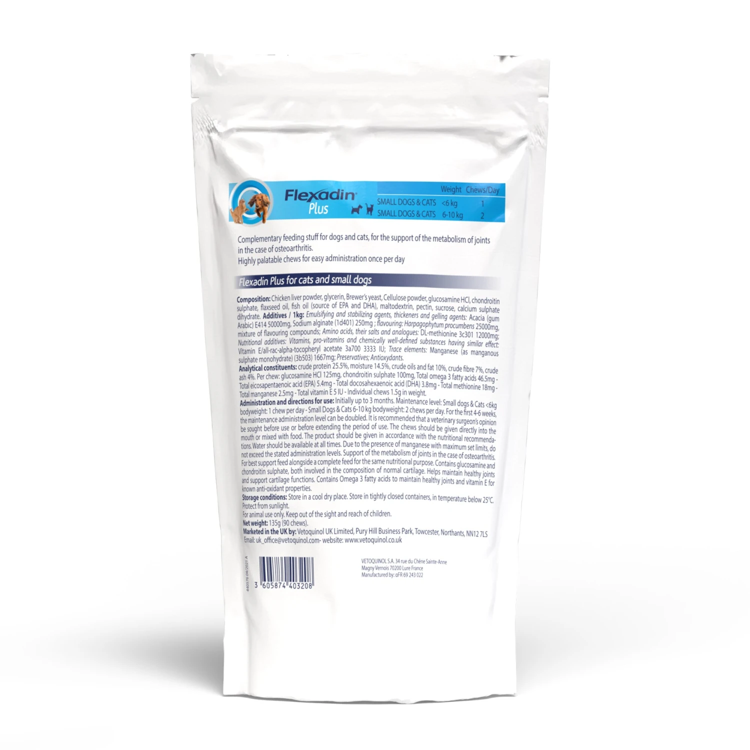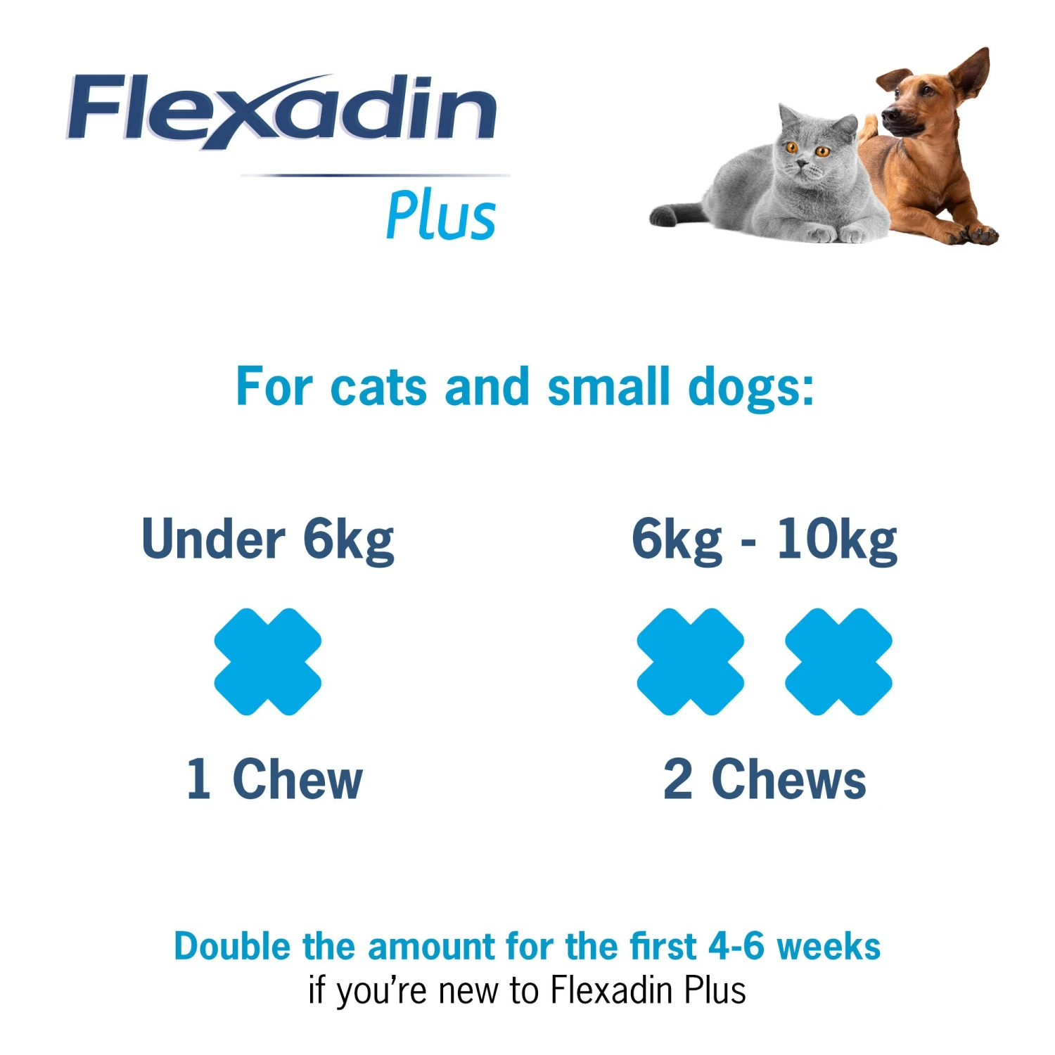 For cats and small dogs breedsunder 10kg, please use Flexadin Plus Joint Supplement Chews for Cats and Small Dogs.