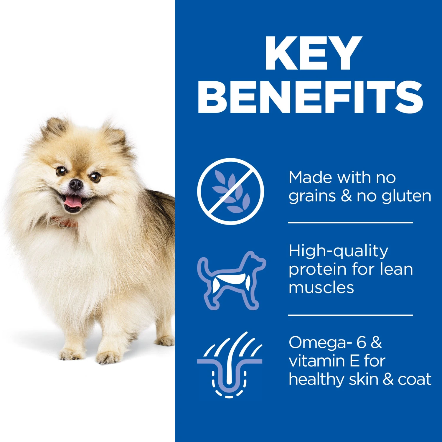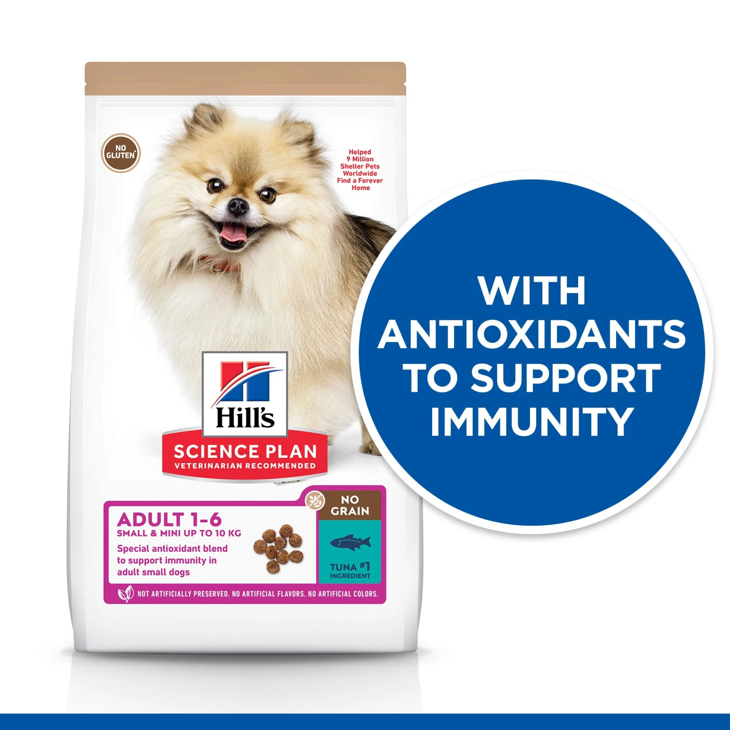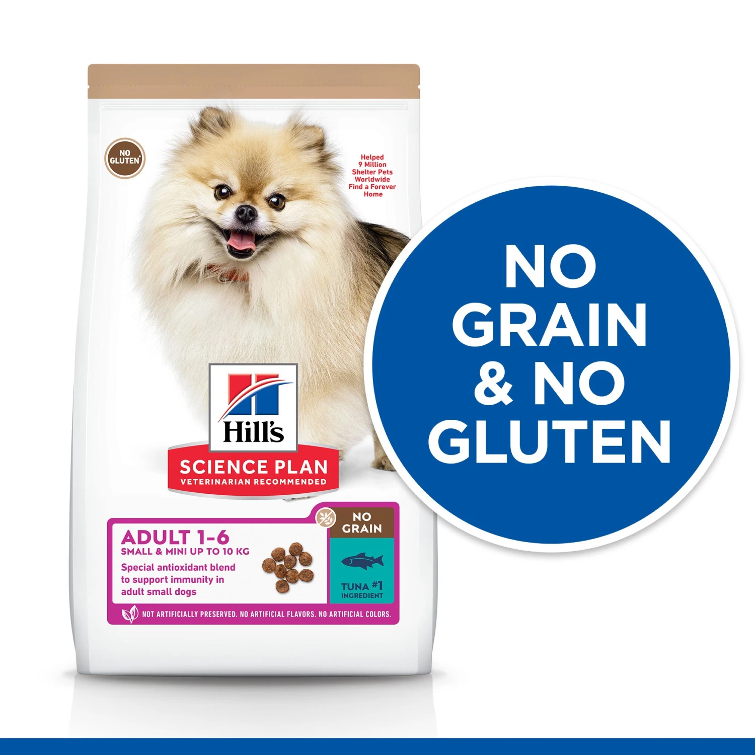 Hill’s SCIENCE PLAN NO GRAIN Small & Mini Adult dog food with Tuna, designed for small mouths. Easy-to-digest nutrition, with high-quality protein for lean muscle maintenance, and omega-6s & vitamin E for healthy coat.