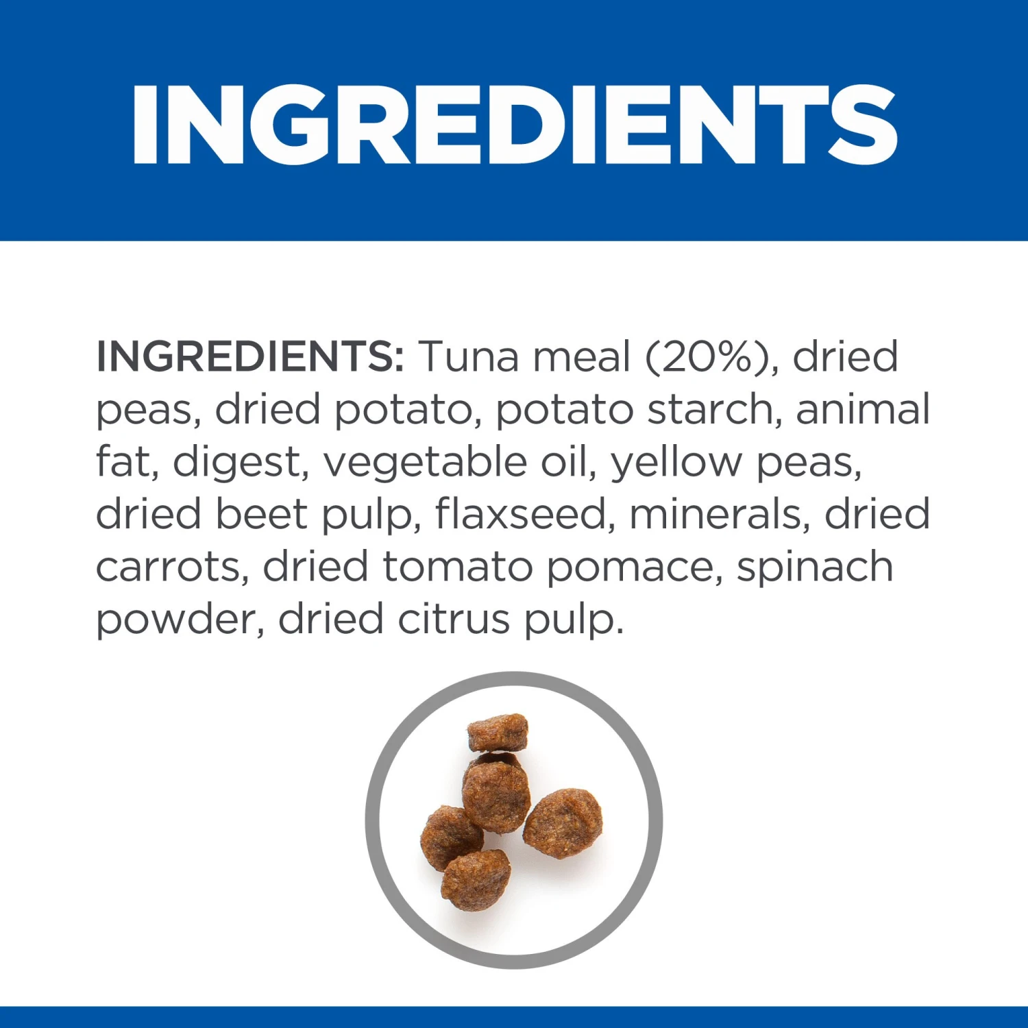 Ingredients:Tuna meal (20%,), dried peas, dried potato, potato starch, animal fat, digest, vegetable oil, yellow peas, dried beet pulp, flaxseed, minerals, dried carrots, dried tomato pomace, spinach powder, dried citrus pulp.