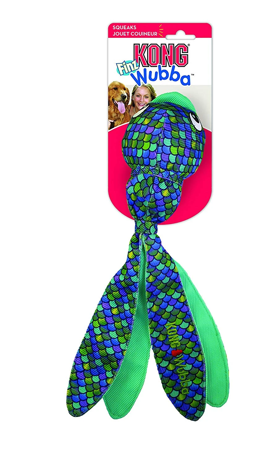 The new KONG Wubba Finz has long floppy tails that make it easy for tugging and super fun for your dog to shake, satisfying natural thrashing instincts. Two balls inside help KONG Wubba Finz bounce and squeak, extending games of catch and release for tons of healthy, active play. This flying fish is made to soar through the air and launch your dog into a fetching frenzy!