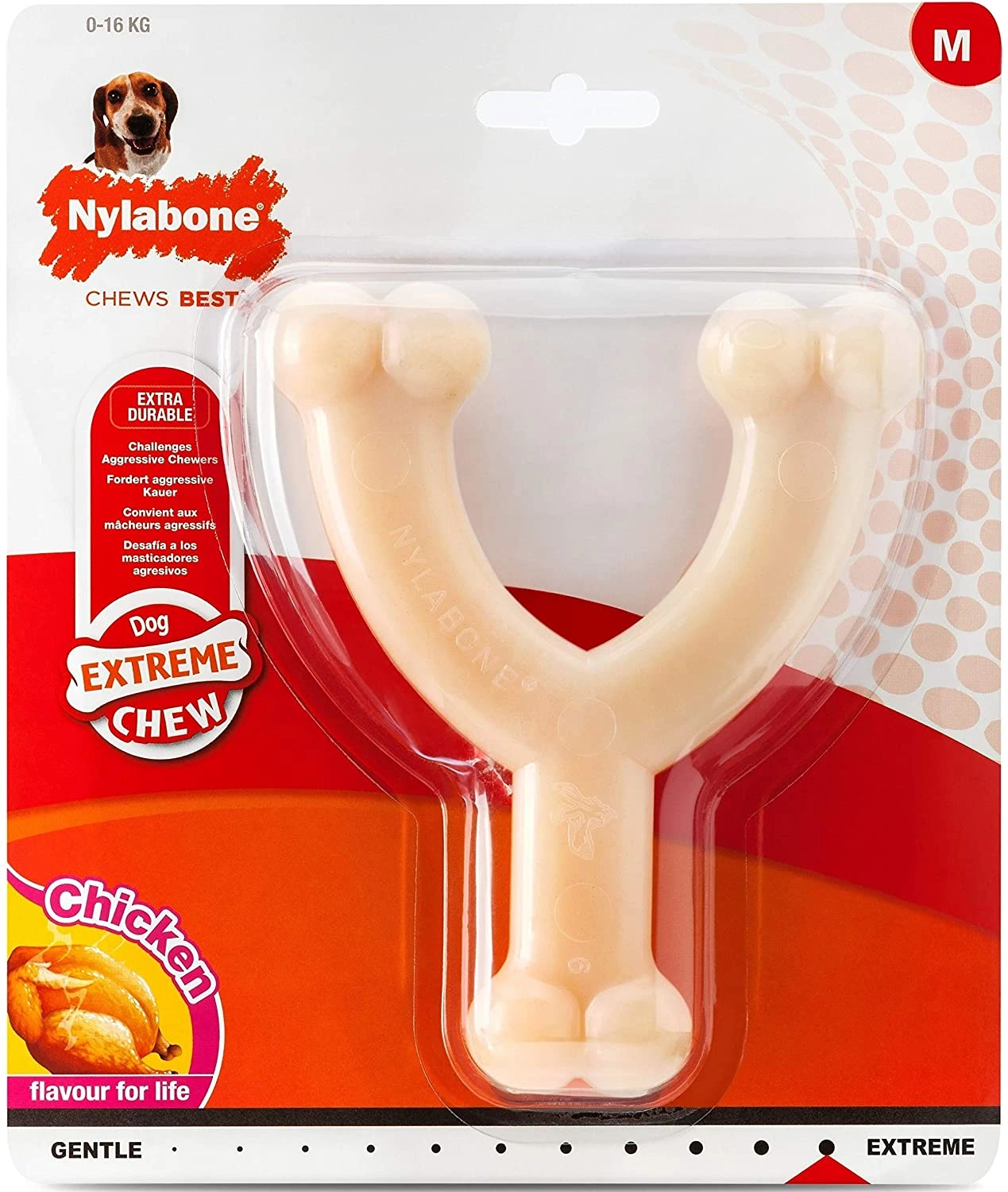 Made with a tough, durable nylon this toy was made with powerful chewers in mind. Challenges aggressive chewers, extra durable, long lasting, flavour throughout. Tiny bristles raise on the bone during chewing, like a mini toothbrush to help keep teeth clean and prevent tartar build up. Satisfy your dogs’ natural urge to chew and keep him busy with something tasty and long lasting to chew on; the materials are as tough as real bones but they don’t have the same dangers. For adult dogs up to 16 kg with an extreme chewing style