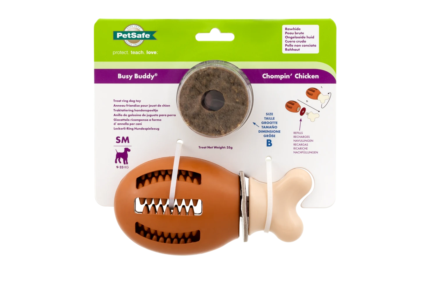 Keep your dog busy and having fun with the PetSafe Chompin’ Chicken. This 3-in-1 toy includes a nylon bone, chicken-scented rubber and refillable treat-holding rings so your pet never gets bored. Rubber nubs and grooves hold smearable treats and clean your dog’s teeth as they play. It includes 4 tasty rawhide treat ring refills that will motivate your dog to keep playing. It’s easy to clean and top-shelf dishwasher safe. For dogs over 6 months old.Â