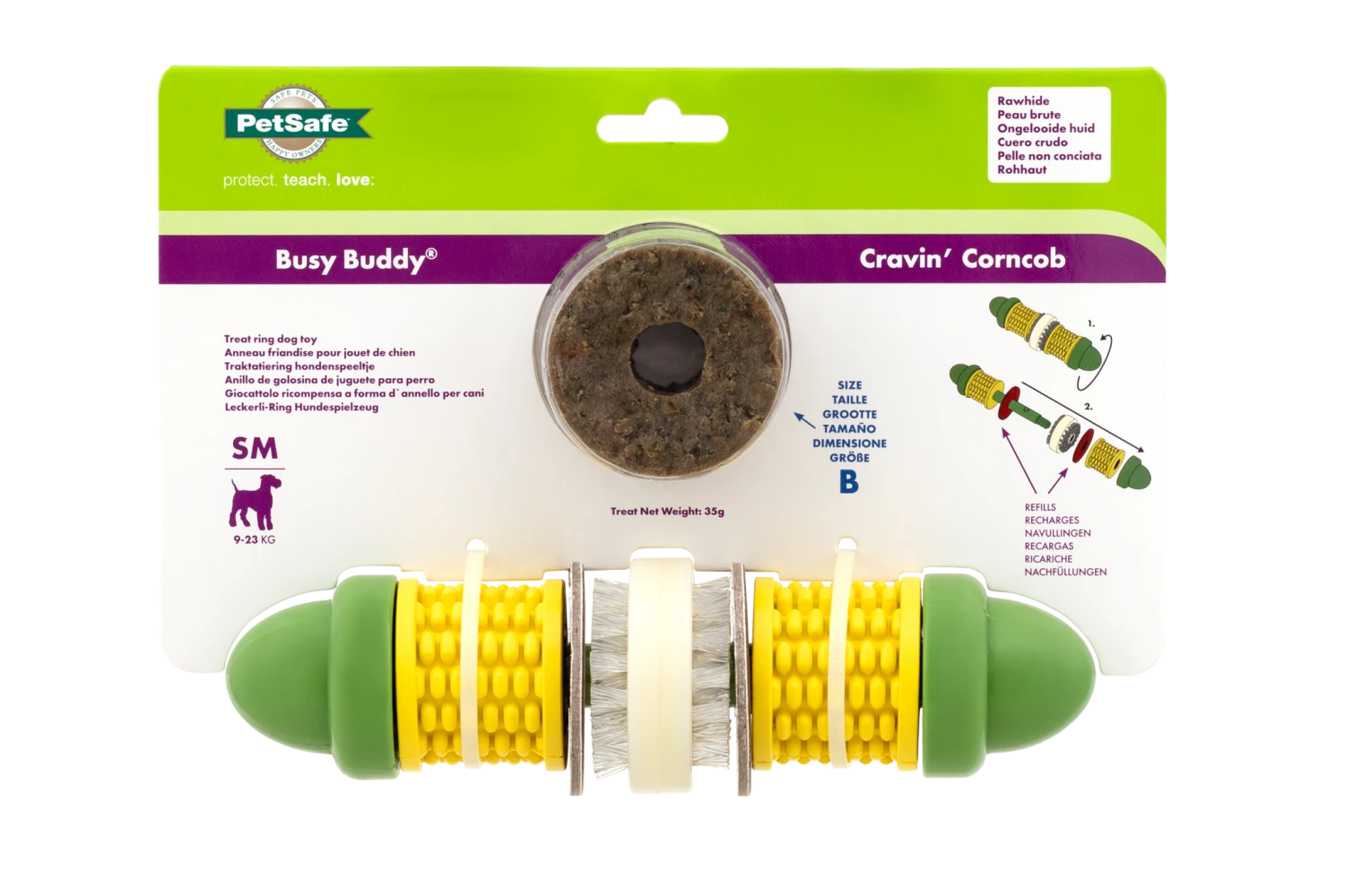 Let your dog brush his own teeth while he’s having a blast playing with the PetSafe Cravin’ Corncob. It has 3 chewing surfaces and a treat ring for your pup to chew on. The butter-scented rubber corncobs and nylon bristles help stimulate gums and keep teeth clean. This toy also includes 4 Busy Buddy treat ring refills (additional treat ring refills available separately). Designed for tough chewers, this fun toy is made from durable nylon and heavy-duty rubber. It’s easy to clean and top-shelf dishwasher safe.Â