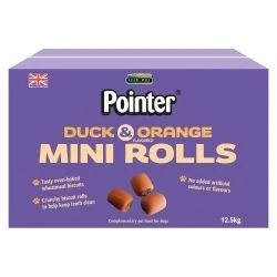 Tasty Tasty Duck and Orange flavoured Oven Baked Wheatmeal crunchy biscuit rolls, to help keep teeth clean with no added artificial colours, flavours or preservatives. Suitable for all dogs over 12 weeks of age. Feed at any time as a treat or reward. Composition Cereals (20% Wheat), Meat and Animal Derivatives (2% Duck Meal), Oils and Fats, Minerals, Various Sugars, Derivatives of Vegetable Origin Analyticals Protein 13%, Crude Fibre 3%, Fat content 11%, Crude Ash 11%