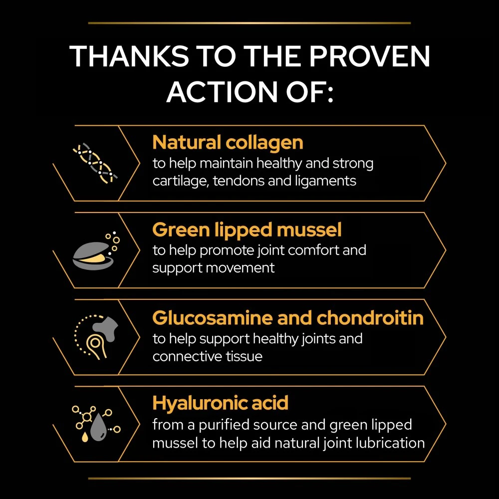 - Helps support mobility and joint health, with collagen, green lipped mussel, glucosamine, chondroitin and purified hyaluronic acid  Â