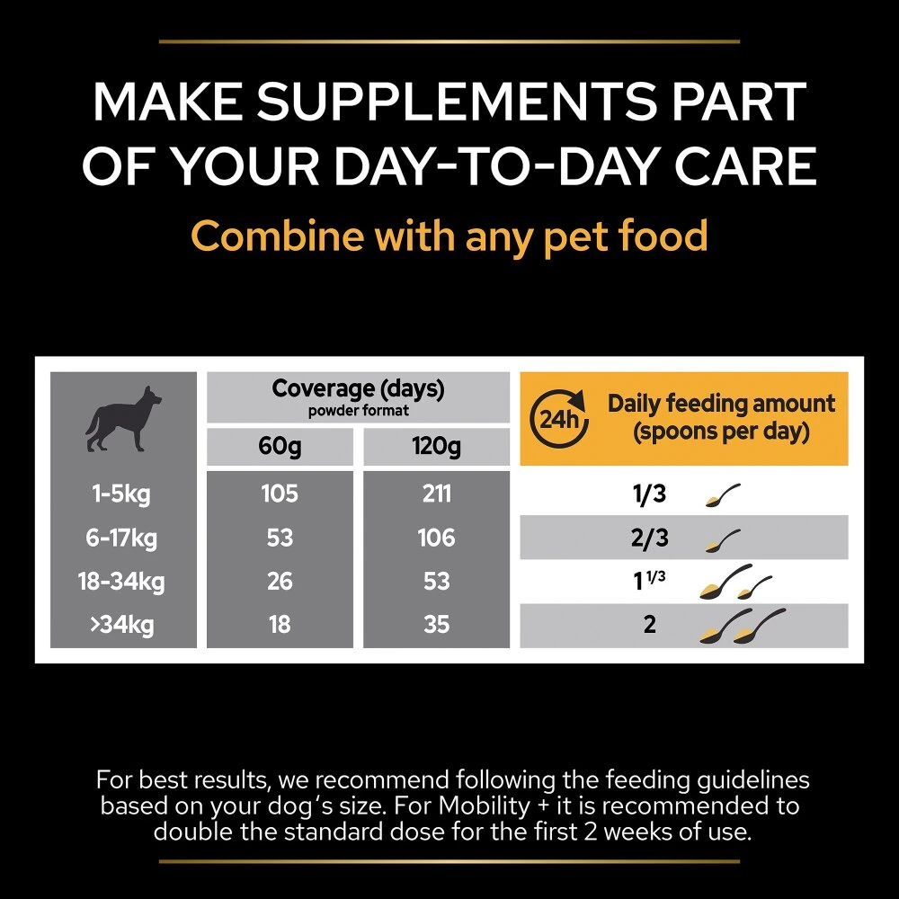 Serve once a day, along with one of your dog’s meal. Place the PRO PLAN Mobility + powder on top of your dog’s food. For best results, use continuously as part of your daily feeding routine.