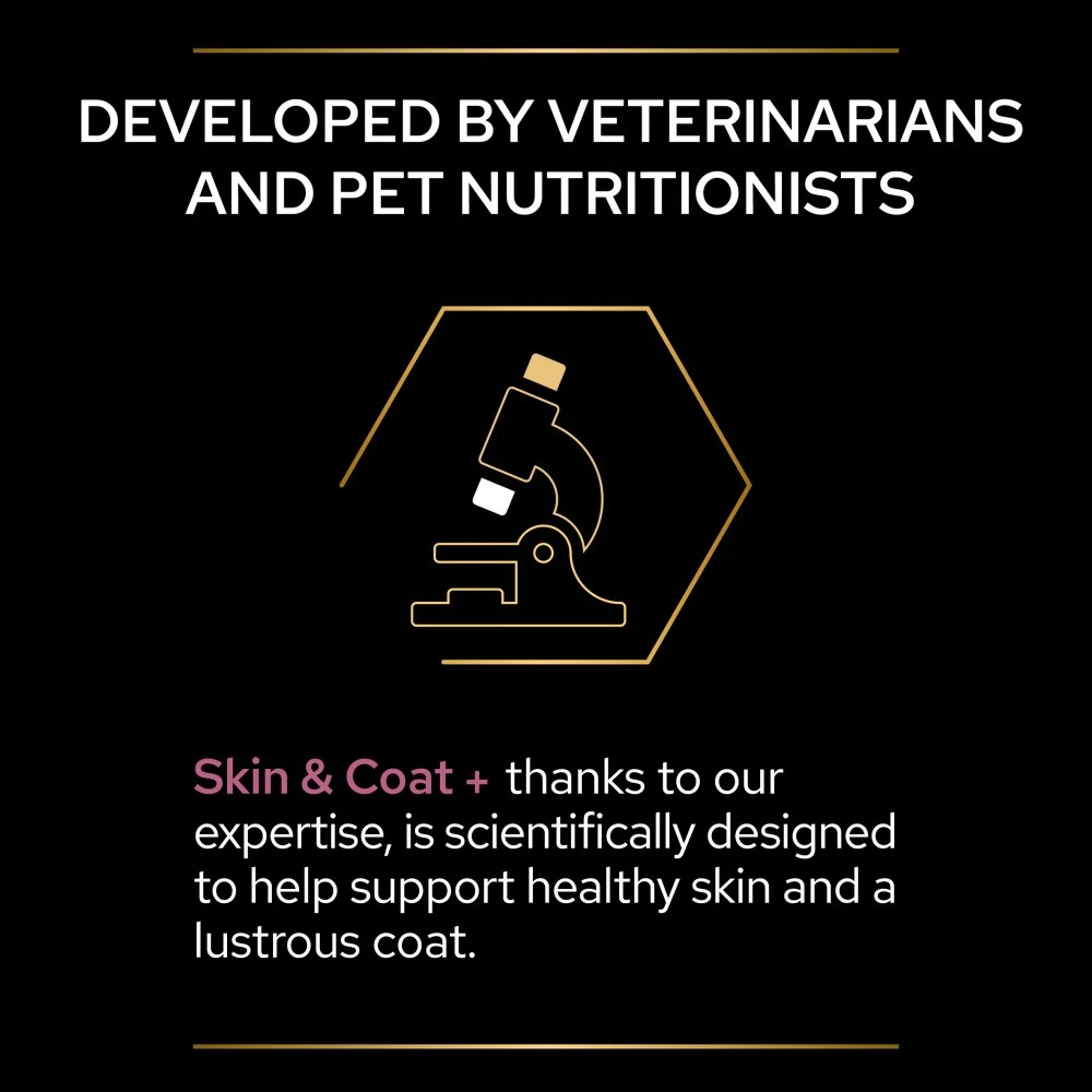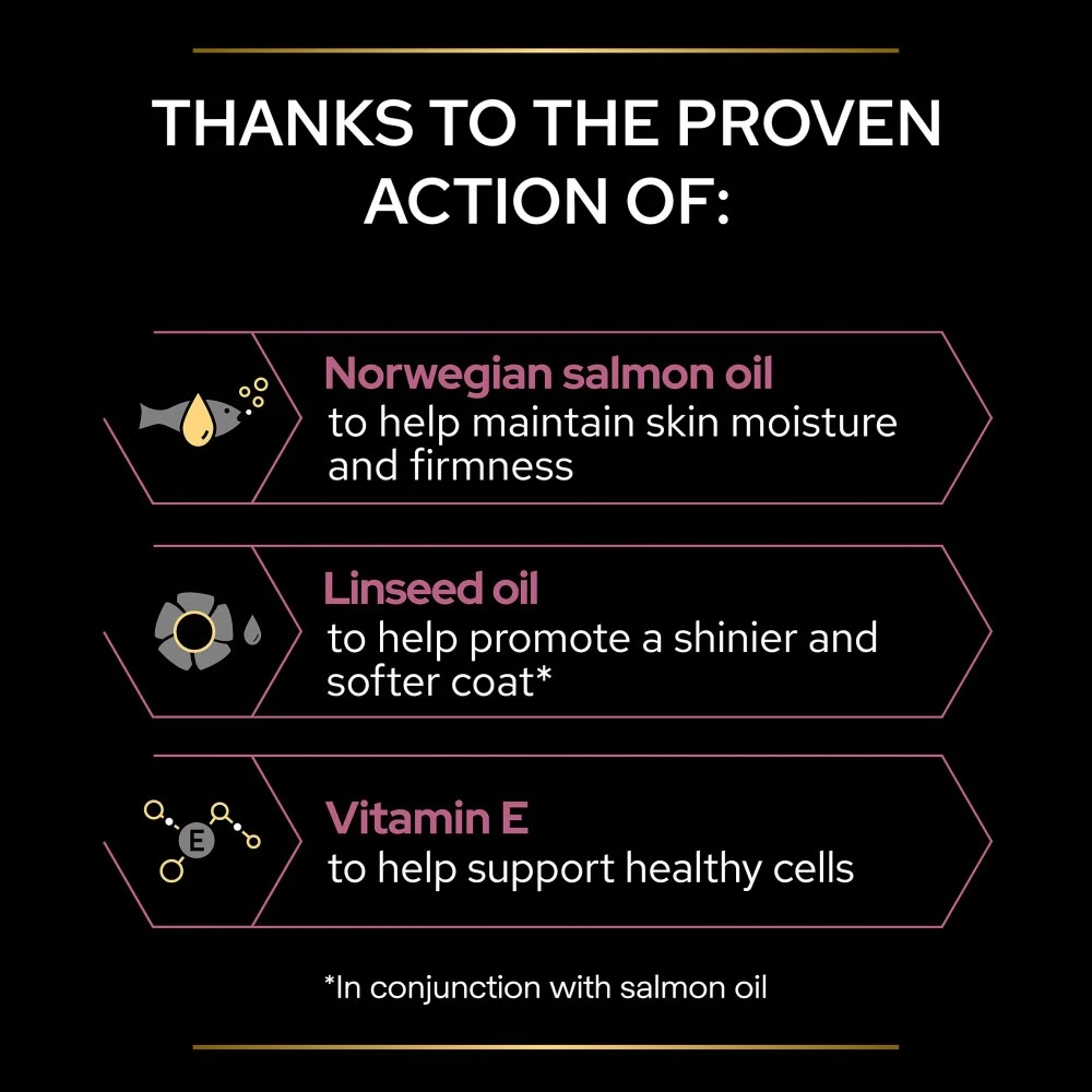 PRO PLAN Skin & Coat + helps nourish your dog’s skin and coat from the inside out, as it contains key nutrients (such as omega 3 & 6 fatty acids from Norwegian salmon oil, linseed oil and vitamin E), and is scientifically designed to: