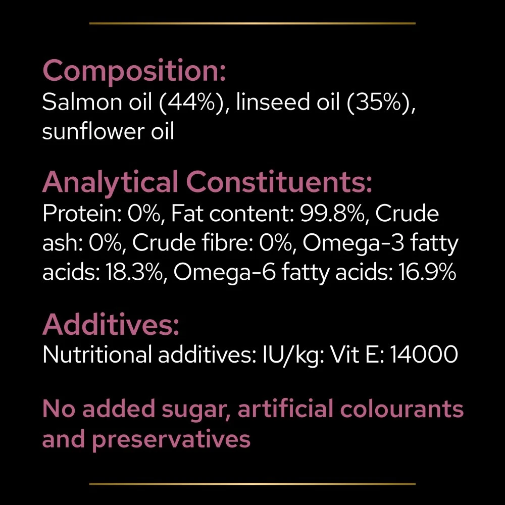 Salmon oil (44%), linseed oil (35%), sunflower oil