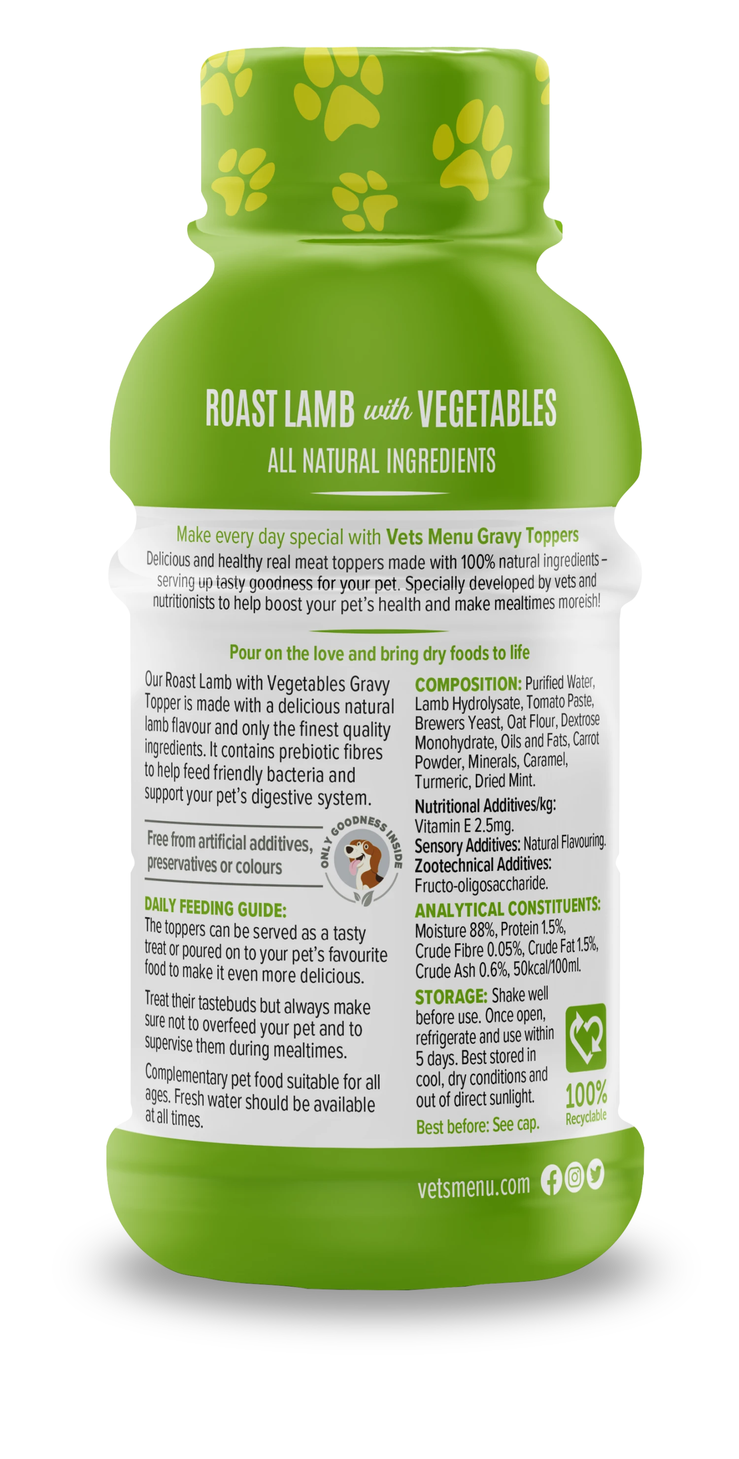 Vets Menu Roast Lamb with Vegetables Gravy Topper is made with a delicious natural lamb flavour and only the finest quality ingredients. It contains prebiotic fibres to help feed friendly bacteria and support your pet’s digestive system.