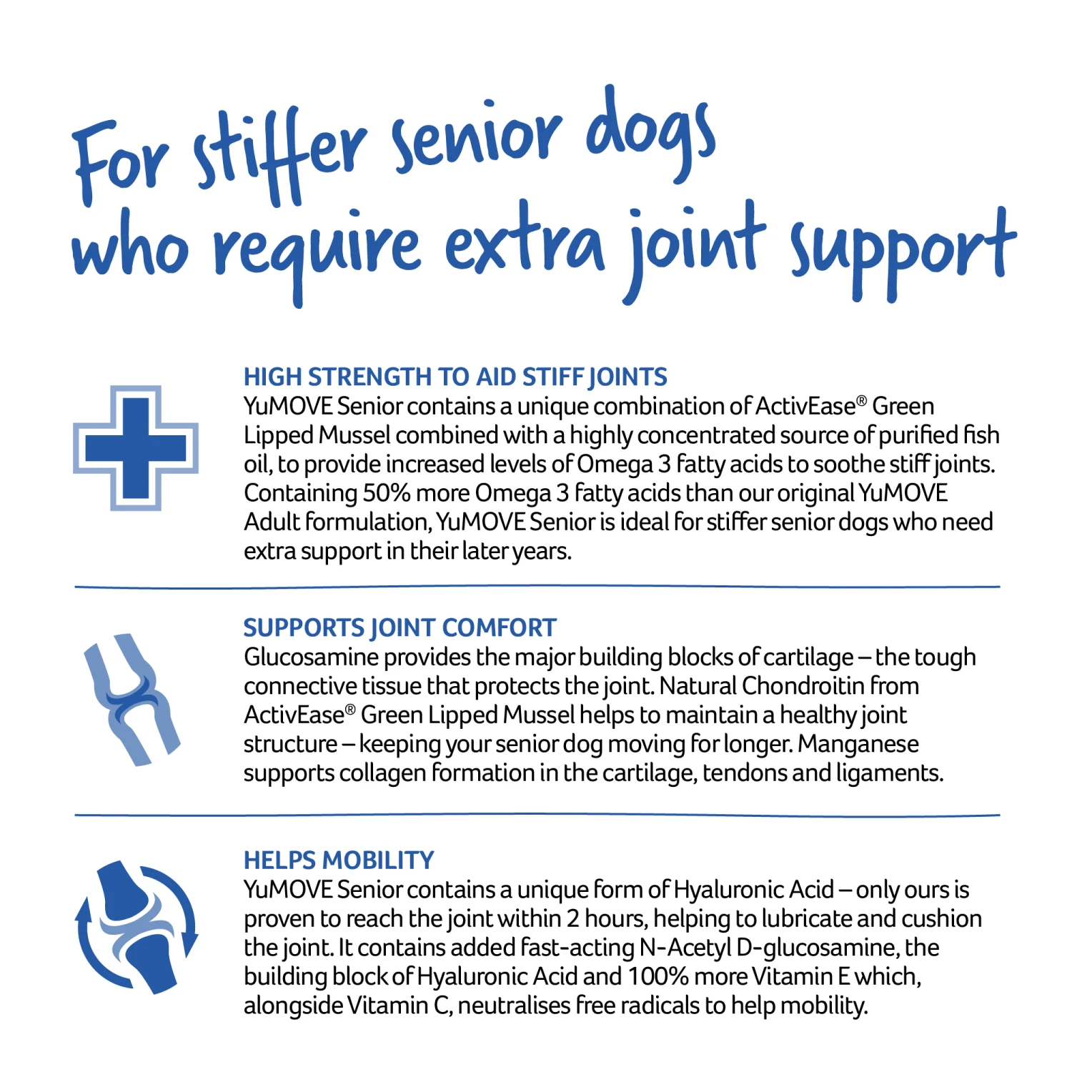 Hyaluronic Acid is a major part of the synovial fluid which helps lubricate and cushion the joint within 2 hours. YuMOVE Senior contains added fast-acting N-Acetyl D-glucosamine, the building block of Hyaluronic Acid and 100% more Vitamin E which, alongside Vitamin C, neutralises free radicals to help mobility.